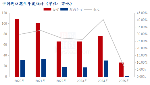 2025年我国花生进口总量为26.4万吨,较2024年大幅下降236.83%,创近七年新低。如图3所示,塞内加尔作为我国重要的花生进口来源国,近年来占比超过四分之一,且进口花生主要用于压榨。然而,因该国政策调整,2025年塞内加尔对华出口仅1.83万吨。该国已宣布将于2026年恢复出口,预计花生出口总量控制在30万至45万吨之间,主要目的地包括中国。据Mysteel农产品了解,国内部分企业已签订塞内加尔花生米采购合同,船期自2月起陆续到港,目前已有预售报价,预期2026年进口结构重塑。