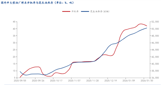 虽然新榨季国内部分中大型油厂开秤、开机时间偏晚,但部分工厂日度到货成交量、压榨量明显提升,上文已提及累计情况不再复述。此外,2026年春节时间为2月17日,因此,节前收购、加工周期相对延长,副产品产量增加。如图4所示,据钢联数据显示,截至2026年1月底,全国中大型油厂样本开机率41.91%,月环比提高4.18%,年同比提高28.21%,处于近年来历史偏高水平;样本油厂花生油库存50200吨,较去年同期增加24.47%。按花生压榨量推算,花生粕累计产量约36万吨。受黄曲霉毒素含量偏高影响,水产及禽类饲料企业采购谨慎,导致花生粕库存积压。返回搜狐,查看更多