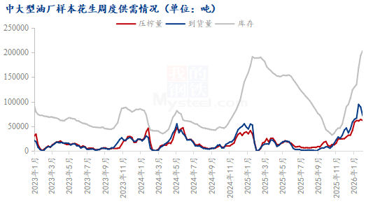 销售不等于消耗,一部分属于库存结构转移至批发市场、食品加工厂、油厂等环节。据钢联数据统计,2025年8月24日至2026年1月底,全国中大型油厂样本花生累计到货成交量约80万吨,累计压榨量约65.6万吨,至1月底库存20.4万吨,月环比增加8万吨、增幅64.74%,年同比增加1.5万吨、增幅8.08%。油厂油料库存持续累积,部分工厂库容趋于饱和,到货车辆络绎不绝,压车收购现象屡见不鲜,市场供应整体充裕。油厂油料库存增加,部分工厂库存充盈,部分到货量时常车水马龙,因而压车收购情况屡见不鲜,市场供应整体充裕。