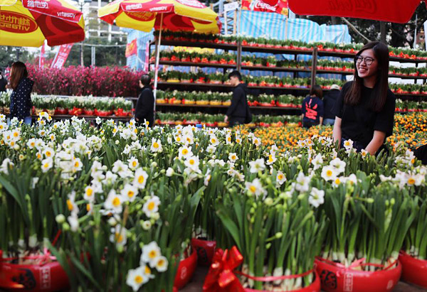 2月2日,人们在香港年宵花市选购花卉。临近春节,香港各大年宵花市一日比一日红火,人们纷至沓来,赏花购物。
