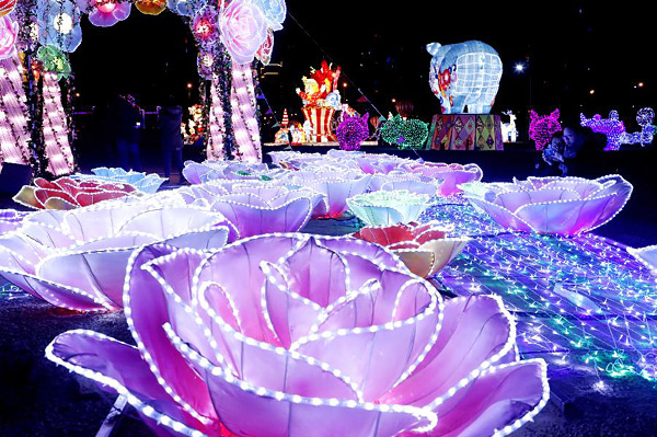 这是2月2日在张家口新春灯会上拍摄的灯组。当日,2019张家口新春灯会在河北张家口市经济开发区老鸦庄镇亮灯,百余个大型灯组璀璨夺目。