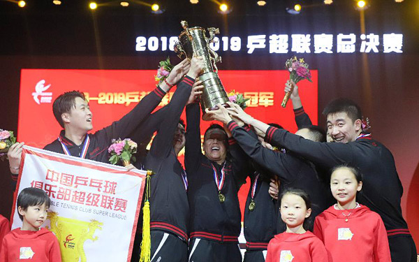 2月2日,天津乒乓球俱乐部队球员高举奖杯庆祝夺冠。当日,在北京举行的2018-2019赛季中国乒乓球俱乐部超级联赛男子团体决赛中,天津乒乓球俱乐部队以3比0战胜上海中星乒乓球俱乐部队,夺得冠军。