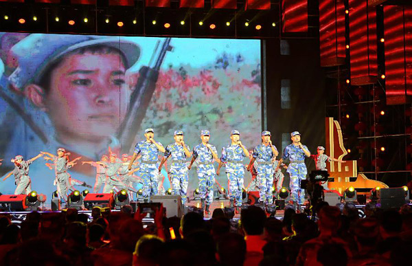 2月1日,在2019三沙市春节联欢晚会现场,驻岛官兵在表演节目。2月1日晚,“我和我的祖国”——2019三沙市春节联欢晚会在海南省三沙市政府大楼前拉开帷幕,三沙市民、驻岛官兵、驻岛工作人员等近1500名观众一起观看了这场军民合办的春晚。